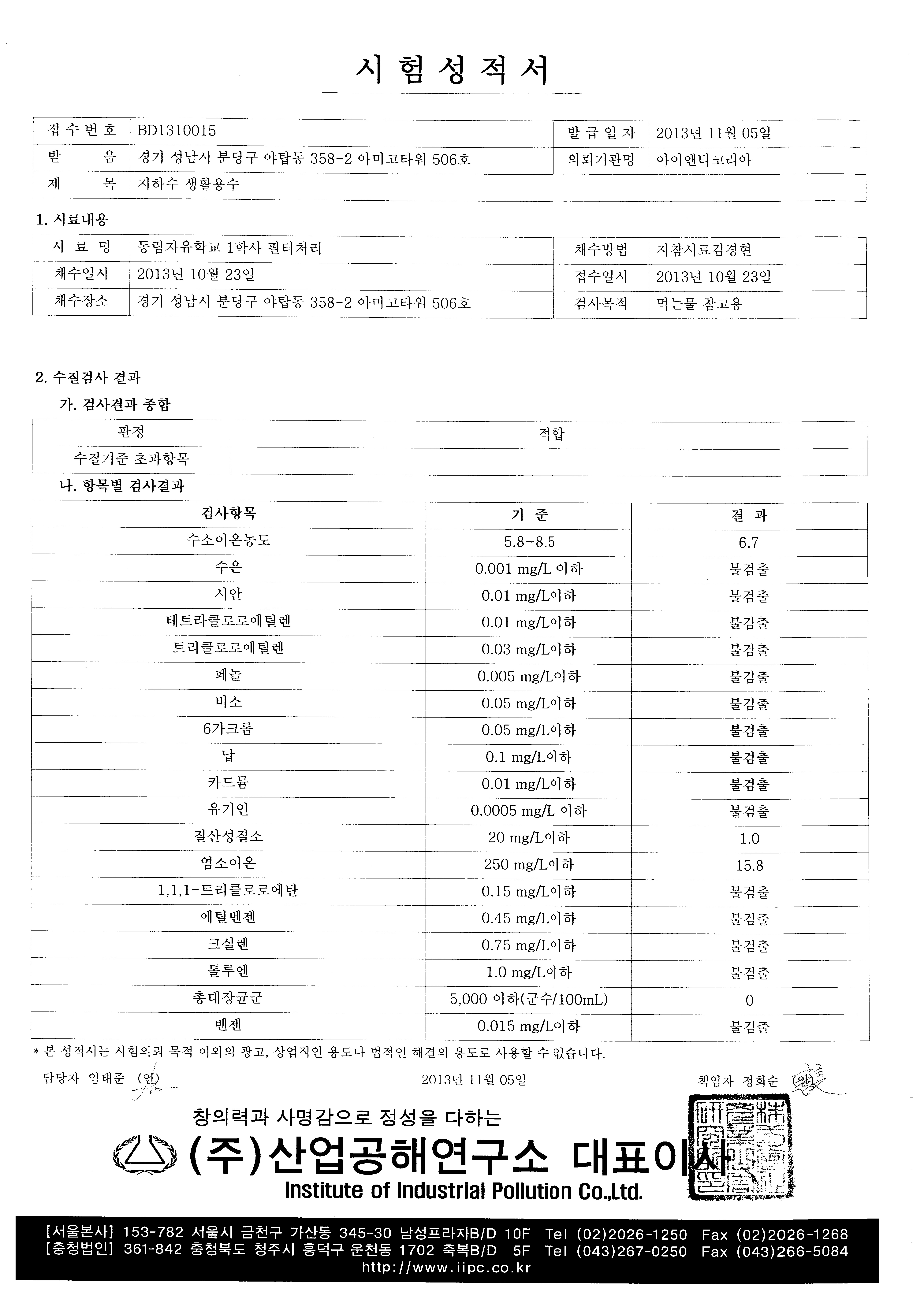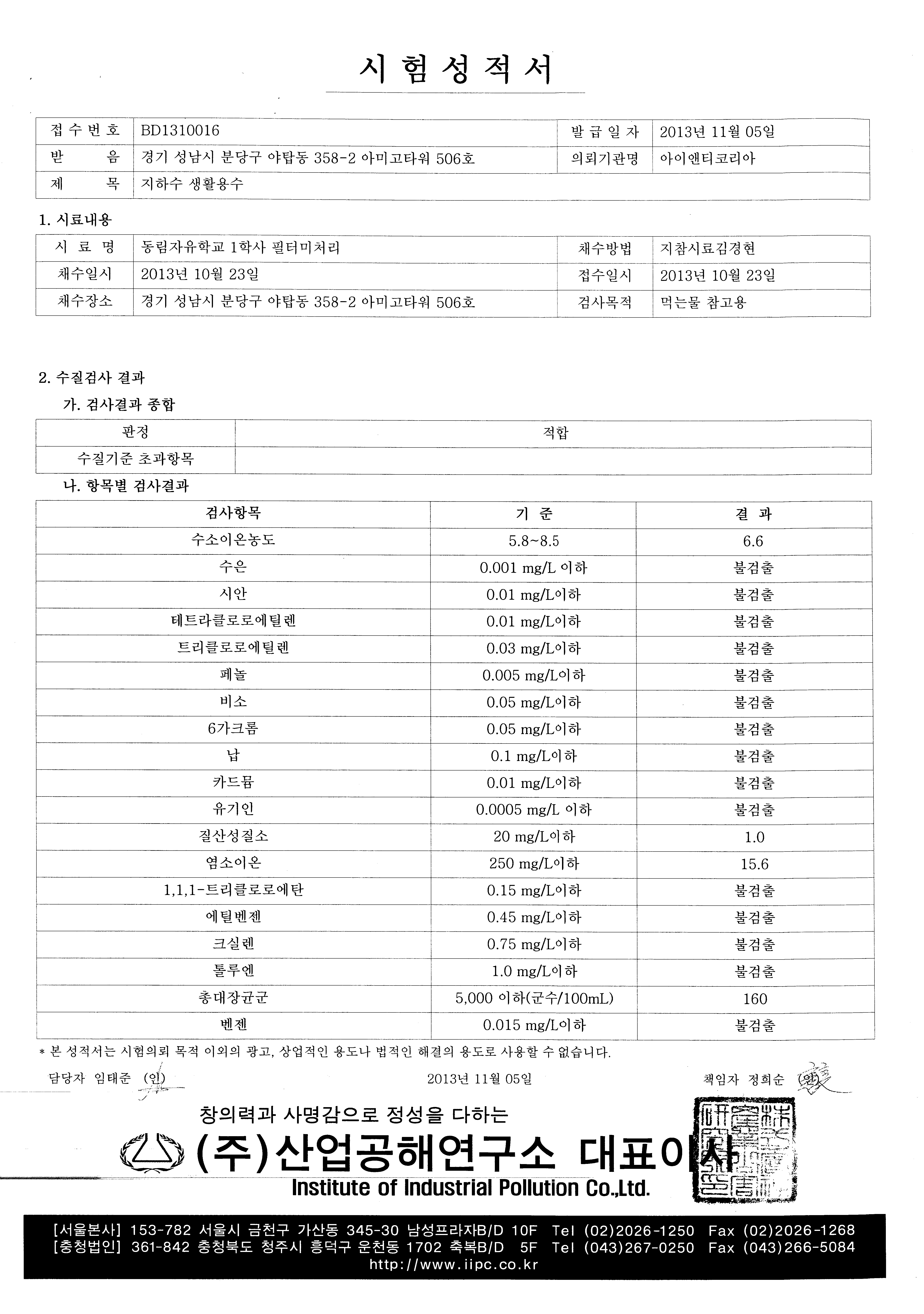 11월 12일 1학사 수질검사결과