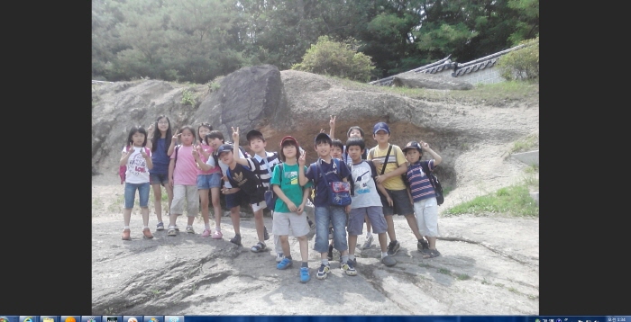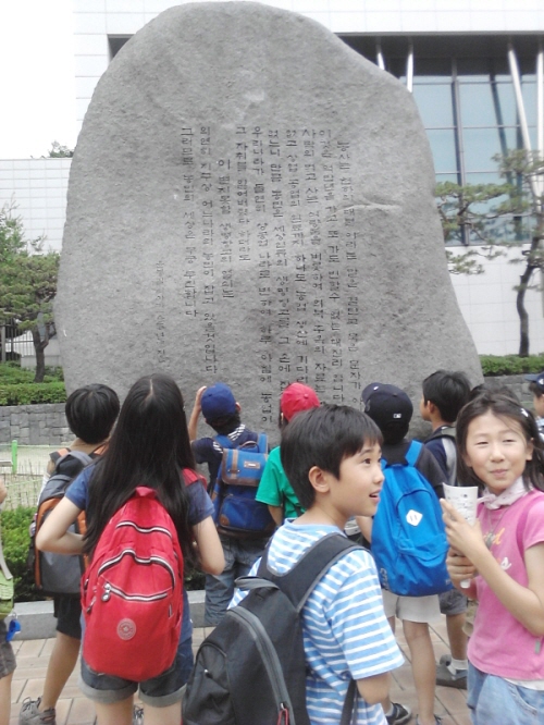 바위 앞에서 아이들이 그 글을 낭송하고 있는 모습입니다.
