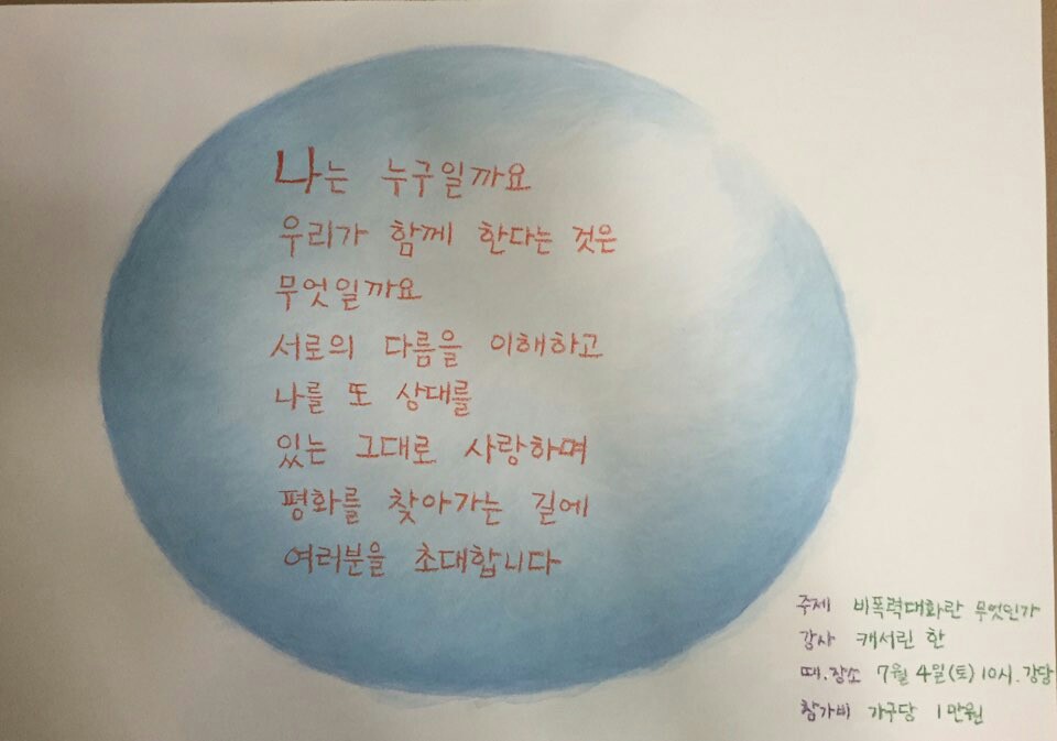 7월 4일 토요일 캐서린 한 한국비폭력대화 센터장의 강연이 있습니다.